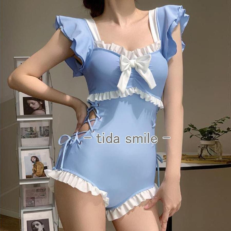 フリル袖 体型カバー ハイウエスト ビキニ ビッグリボン スイムウエア 配色水着 韓国風 リゾート サマー海