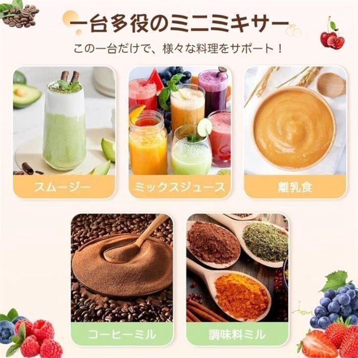 【強力パワー&一台多役】ミニミキサーは40Wの純銅モーターとステンレス刃を搭載し、強い粉砕力が持っています。最大21000回/分の高速回転で、氷などの固い食材もあっという間に砕けます!この一台だけで、スムージーやミックスジュースや離乳食を作ることはもちろん、コーヒーミルや調味料ミルにも役に立っています。毎日美味しくて新鮮なジュースから、健康の生活をはじめましょう!\u003cbr\u003e