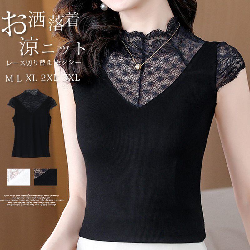 サマーニット 即購入OK レディース トップス 半袖 レース切り替え セクシー 大人 可愛い 透け感 シースルー ラウンドネック 薄手 涼ニット ラウンドネックニット 清楚系 ニットトップス 大人 すっきり 映える お洒落着 ファッション meizi12 | オキナ商店