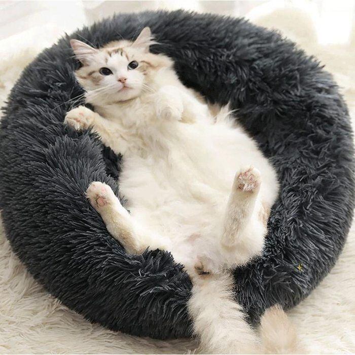 毛足の長いファーがふかふかで気持ちいいドーナツ型のペットベッドM、Lサイズです。