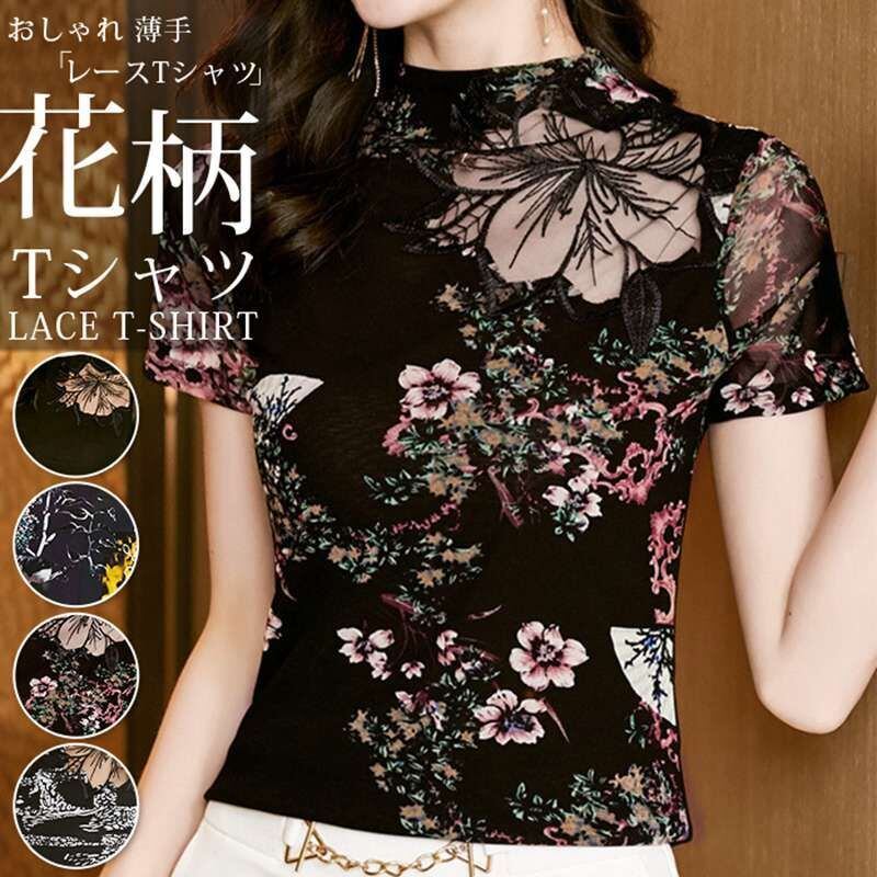Tシャツ レディース 即購入OK レースTシャツ 花柄 40代 50代 モックネック カットソー かわいい 夏 コーデ カジュアル ティーシャツ 大人 おしゃれ 薄手 半袖 meizi20 | オキナ商店