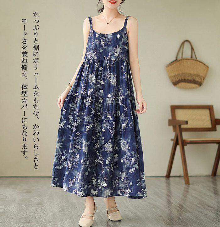 ティアード ワンピース レディース 春 夏 キャミワンピース ロング丈 ジャンパースカート 花柄 ドッキング Uネック レイヤード オールインワン 総柄 重ね着 フレア タック ロングワンピース ギャザー 大きいサイズ 体型カバー おしゃれ リゾート