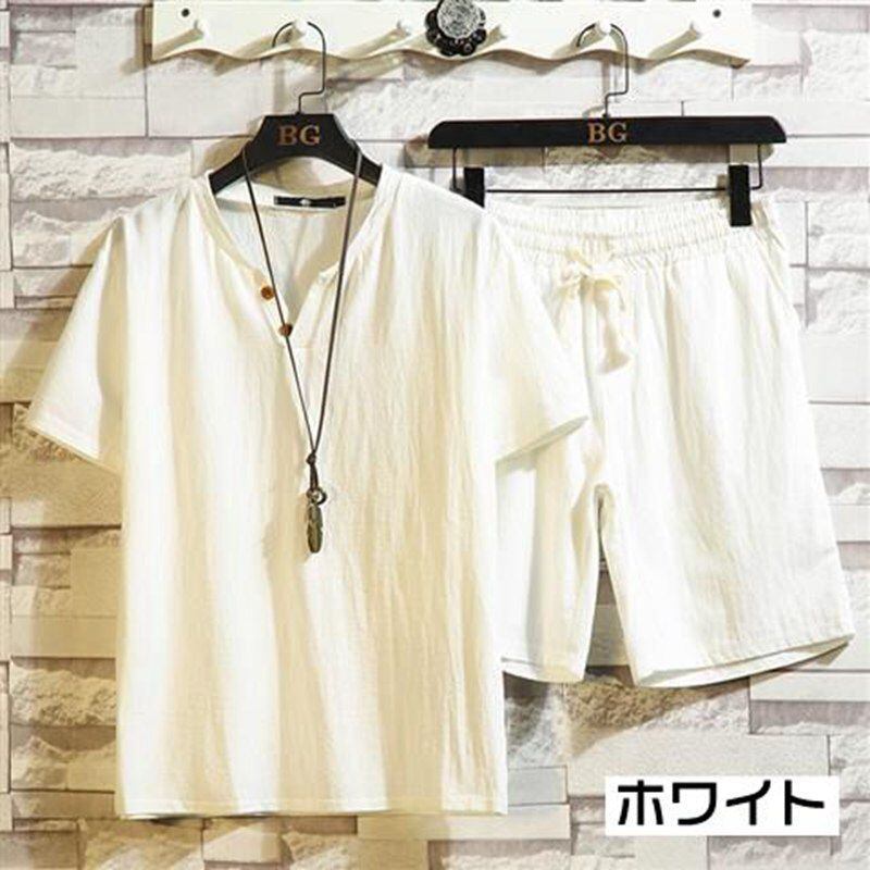 上下セット メンズ 綿麻 未使用 セットアップ 夏 薄手 半袖 Tシャツ Vネック ハーフパンツ ウエストゴム ルームウエア 部屋着 ゆったり 涼しい 快適 無地 おしゃれ カジュアル 父の日 fuyi10 | オキナ商店