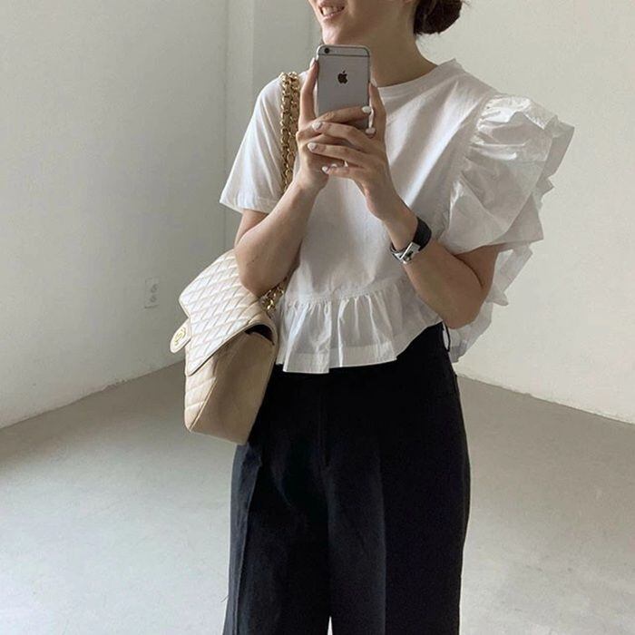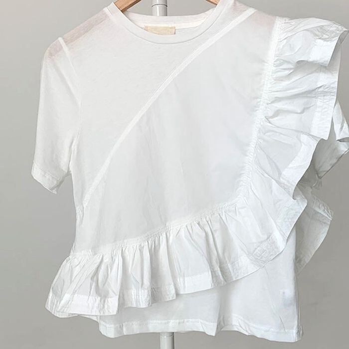 フリル 即購入OK Tシャツ レディース 半袖 フリル袖 Tシャツ 無地 トップス 切り替え カットソー 綿 コットン フレア袖 春 秋 夏 きれいめ ブラウス ゆったり 可愛い お洒落 着回し抜群 カジュアル 体型カバー xzzhang389 | オキナ商店