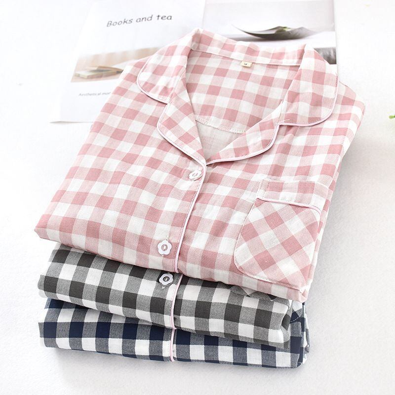 ルームウェア レディース 未使用 メンズ 上下セット ダブルガーゼ 綿100% チェック柄 パジャマ 柔らか ナイトウェア 部屋着 長袖 ロングパンツ ウエストゴム おしゃれ 寝間着 セットアップ リラックスウェア liangyi81 | オキナ商店