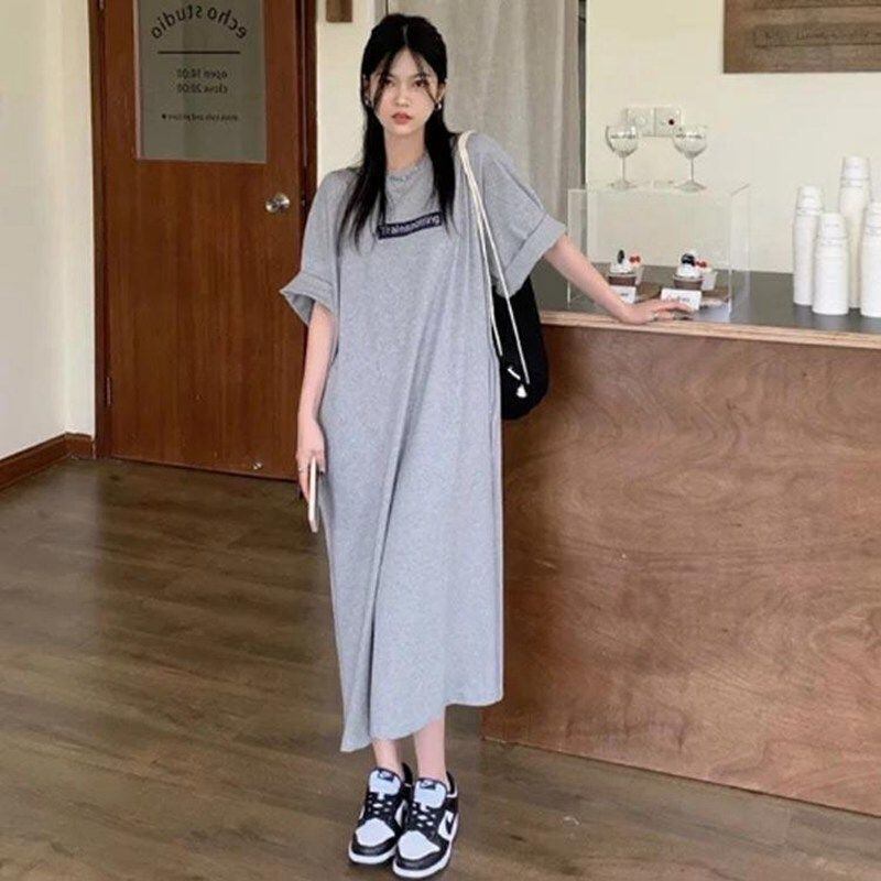 半袖 ロゴ ロングワンピース Tシャツ スウェット カットソー 大きめ スリット プルオーバー 部屋着 マキシ マキシワンピ 五分袖 ロング xzxiaoyun437