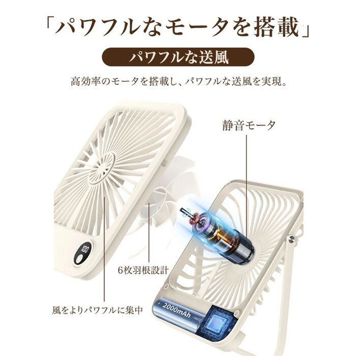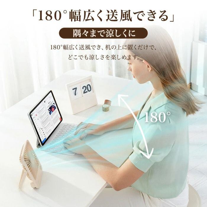 さらに、この扇風機は超静音設計で、勉強や仕事の集中を妨げません。LED電池残量表示が一目でわかり、3段階の風量調節が可能です。180°調節可能なスタンド付きで、風の向きを自由に変えられるため、使用シーンに合わせて最適な冷却を実現します。アロマ機能も搭載されており、涼しさと共に心地よい香りを楽しむことができます。