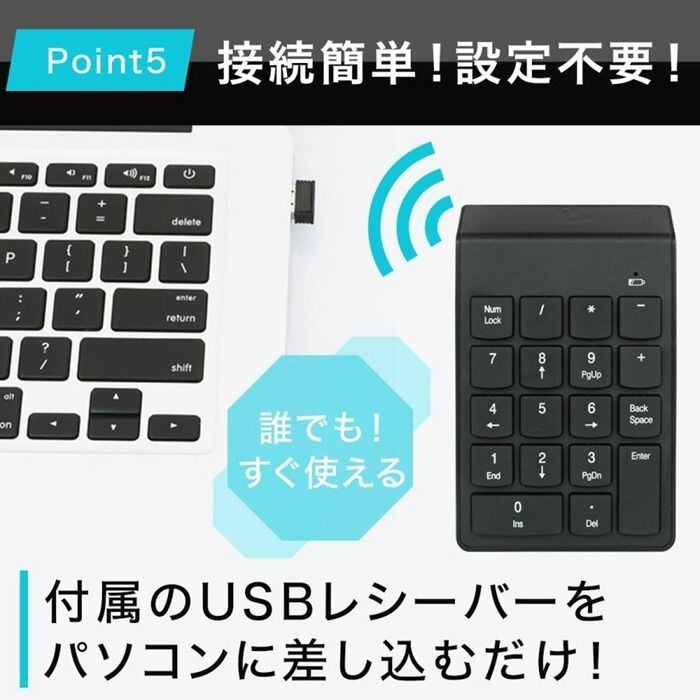 小型軽量・薄型タイプで持ち運びにも便利なワイヤレステンキーです。