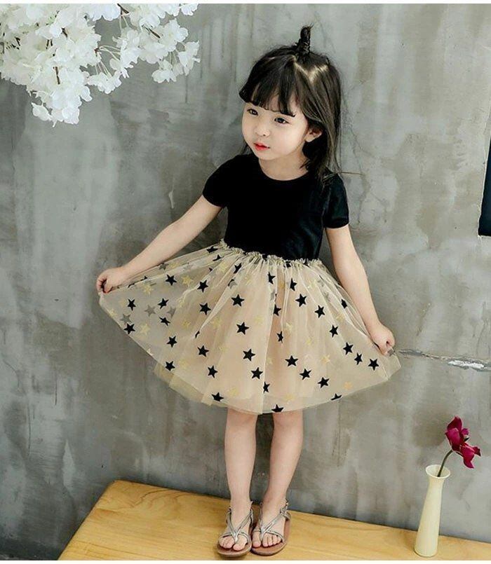 女の子 ワンピース 即購入OK ドレス 半袖 切り替え 星柄 キッズ チュールワンピース チュールドレス 黒 カジュアル 普段着 通学 通園 発表会 フォーマル 80-130 sjxz48 | オキナ商店