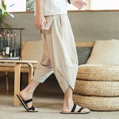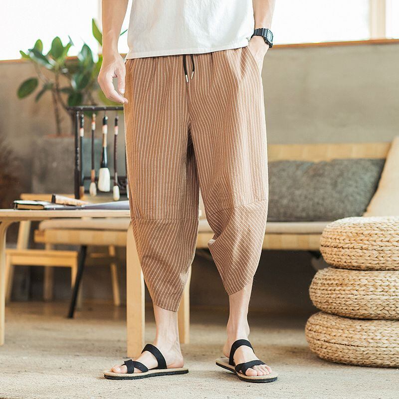 メンズ サルエルパンツ 大きいサイズ 七分丈 アラジン ワイド ハーフ ゆったり 縦縞 縦ストライプ ユニセックス 綿麻 エスニック 袴パンツ ポケット 父の日
