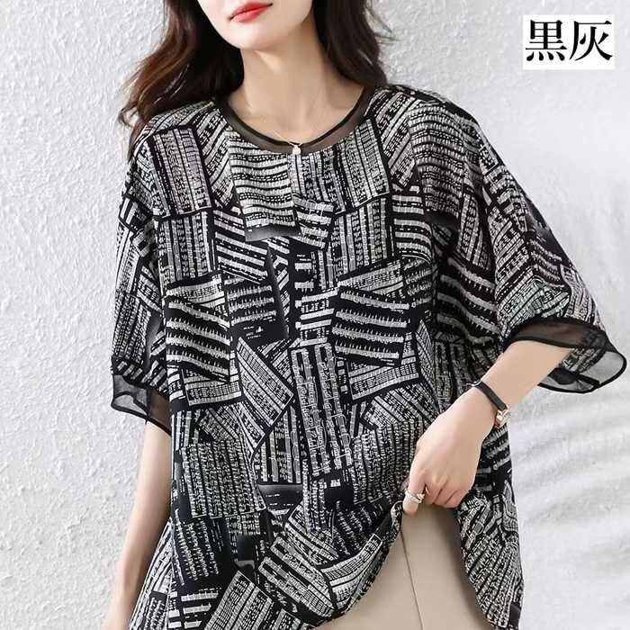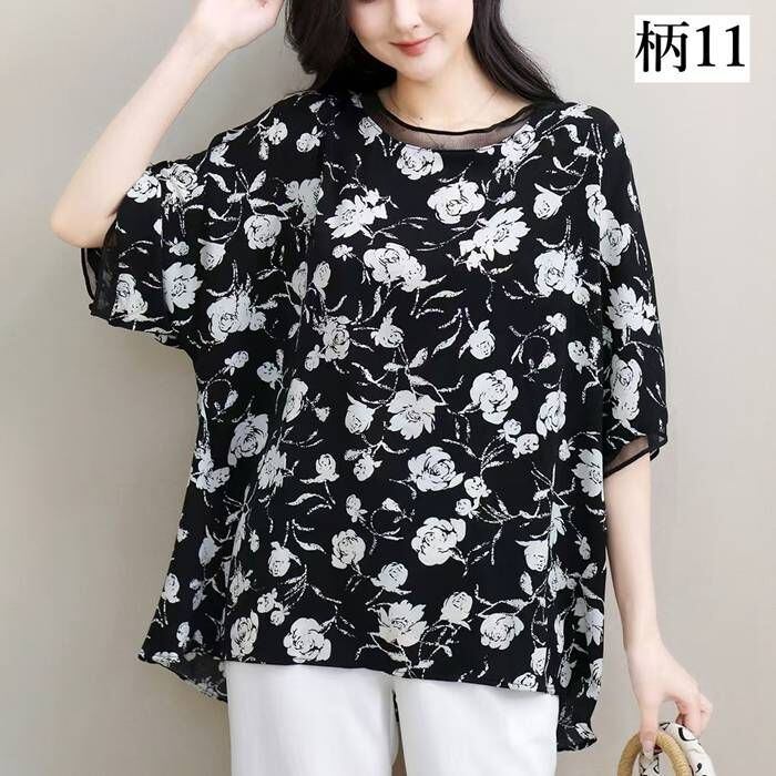 Tシャツ レディース 花柄 チュニック プルオーバー クルーネック 夏 5分袖 半袖 トップス 薄手 透け感 シアー ゆったり 大人可愛い お尻が隠れる 体型カバー 水玉柄 総柄 カジュアル きれいめ おしゃれguwei03