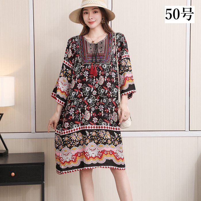 総柄 チュニック レディースエスニック 即購入OK 長袖 七分袖 ワンピース 膝丈 クルーネック 夏 薄手 ゆったり 大人可愛い 体型カバー リゾート 旅行 ビーチ カジュアル きれいめ おしゃれguwei06 | オキナ商店