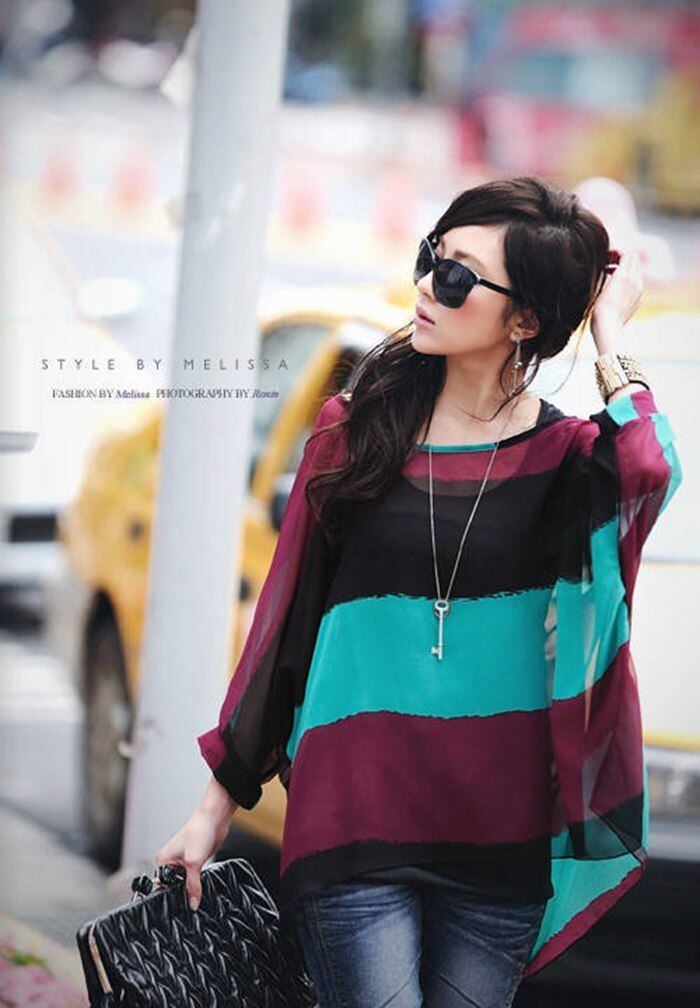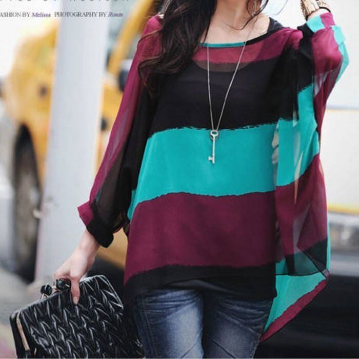 ブラウス レディース ドルマンスリーブ即購入OK シースルー 長袖 シフォン 上着 トップス 透け感 コーデ レイヤード 体型カバー ボーダー柄 薄手 クルーネック きれいめ 夏 カジュアル おしゃれjingpin03 | オキナ商店