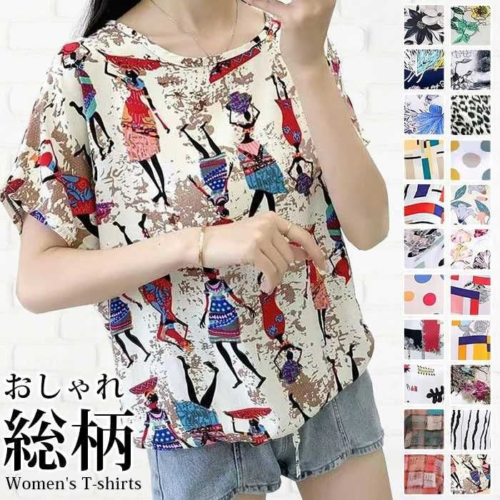 Tシャツ レディース未使用 カットソー 夏 薄手 総柄 エスニック 半袖 クルーネック ゆったり 大人可愛い 体型カバー カジュアル きれいめ おしゃれ リゾート 旅行 ビーチguwei08 | オキナ商店