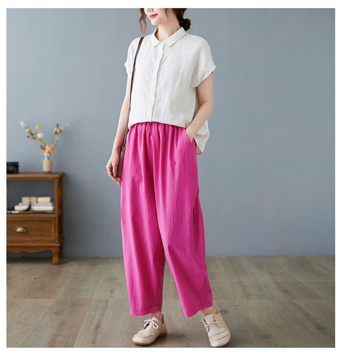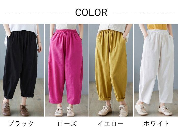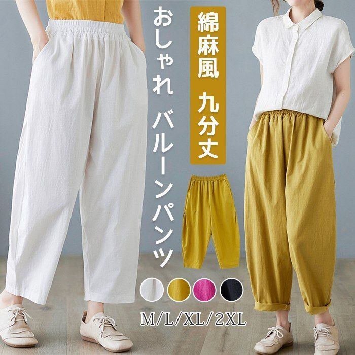 バルーンパンツ購入OK レディース ロング丈 パンツ 綿麻風 九分丈 リネン混パンツ ウエストゴム 夏 無地 カジュアル 体型カバー きれいめ 通勤 OL シンプル ゆったり おしゃれ リゾートabm108 | オキナ商店