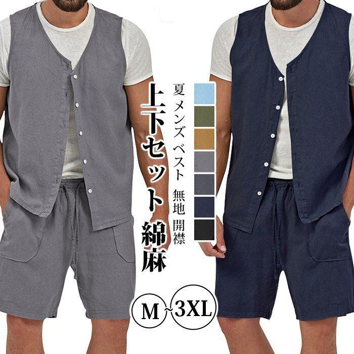 上下セット 綿麻 夏 メンズ ベスト コットンリネン ハーフパンツ 無地 開襟 vネック 綿麻風 セットアップ 大きいサイズ カジュアル ルームウェア 部屋着 薄手 yifengyu190 | オキナ商店