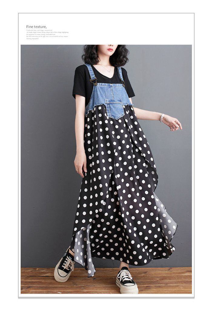 ジャンパースカートレディース 夏 サロペット スカート ドット柄 水玉 デニム切替 キャミワンピース ロング丈 フレアワンピ ゆったり カジュアル 体型カバー 大きいサイズ レイヤード 重ね着 着?せ 大人可愛い 森 韓国服 abm117 | オキナ商店