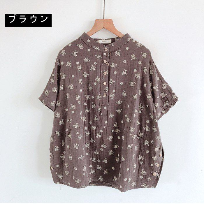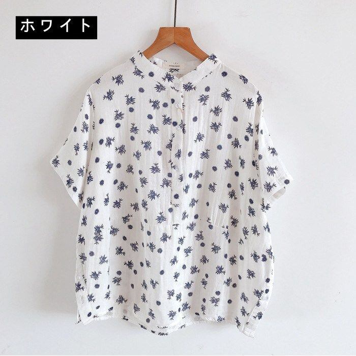 ガーゼ シャツ レディース 半袖 スタンドカラー シャツ ダブルガーゼ 綿 スウェット コットン トップス カジュアル 夏 柔らかい 大人 かわいい ナチュラル 総柄 キレイめ gulihua15 | オキナ商店