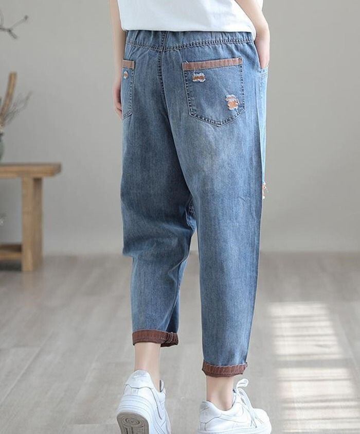デニムパンツ レディース テーパードパンツ ボトムス ジーパン 森ガール サルエルパンツ 無地 ズボン ウエストゴム 大きいサイズ 柔らかい ゆったり 体型カバー 薄手 オシャレ カジュアル ファッション 送料無料 huiya25 | オキナ商店