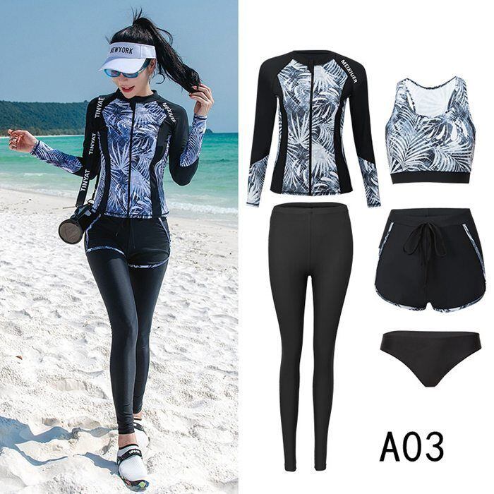 【5点セット内容】長袖ラッシュガード+スポーツブラ+ショートパンツ+ショーツ+レギンス。前面ジップアップなので着替えも楽々◎もちろん紫外線対策もばっちりでお肌を守ります、防菌防臭UVカット