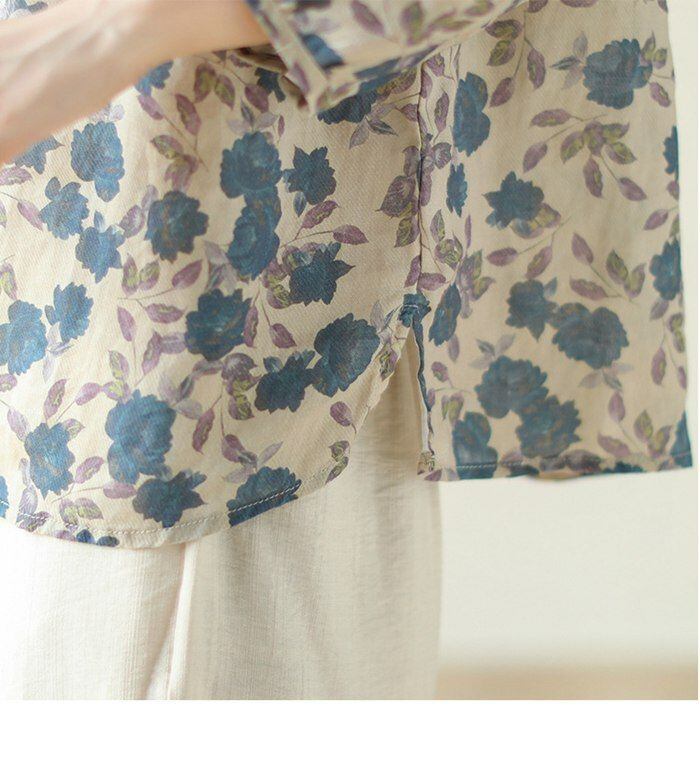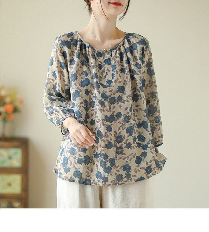 花柄ブラウス レディース シャツブラウス クルーネック プルオーバー 夏 七分袖 ブラウス チュニック 綿麻風 ゆったり トップス 大人 可愛い お洒落 キレイめ カジュアル ナチュラム エレガント 送料無料 guyan101 | オキナ商店