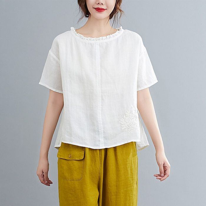 ブラウス レディース 半袖 不規則 リネンチュニック 花柄 刺繍 クルーネック Tシャツ tシャツ プルオーバー 綿麻風 大人 可愛い 薄手 ゆったり おしゃれ エレガント ファッション 森ガール 春 夏 送料無料 guyan100 | オキナ商店