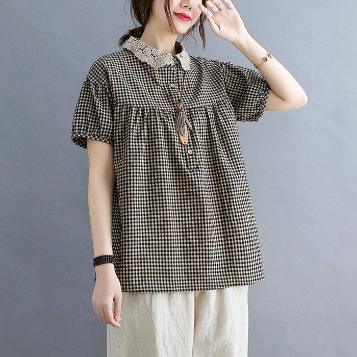 ブラウス 夏 レディース レース襟ブラウス ギンガムチェック 半袖 ブラウス コットン トップス プルオーバー 綿 チェック柄 ナチュラル 森ガール Tシャツ キレイめ 大きいサイズ ゆったり 体型カバー 夏 大人可愛い 送料無料 chaoliu395 | オキナ商店