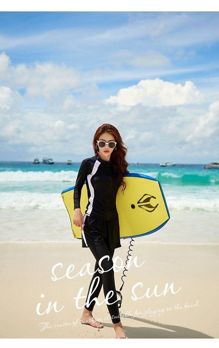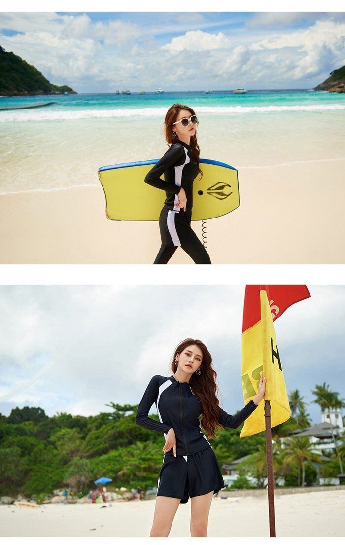 【5点セット内容】長袖ラッシュガード+スポーツブラ+ショートパンツ+ショーツ+レギンス。前面ジップアップなので着替えも楽々◎もちろん紫外線対策もばっちりでお肌を守ります、防菌防臭UVカット