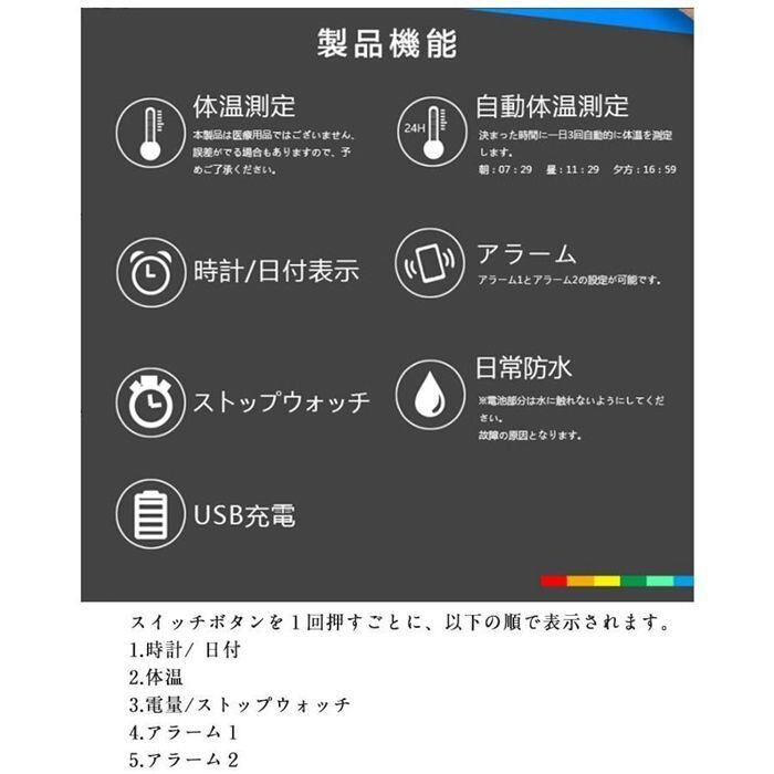 温度計 ブレスレット 目覚まし時計 タイマー バンド アラーム 振動 体温モニター温度計 温度測定 防水 振動モーター 充電式 バッテリー
