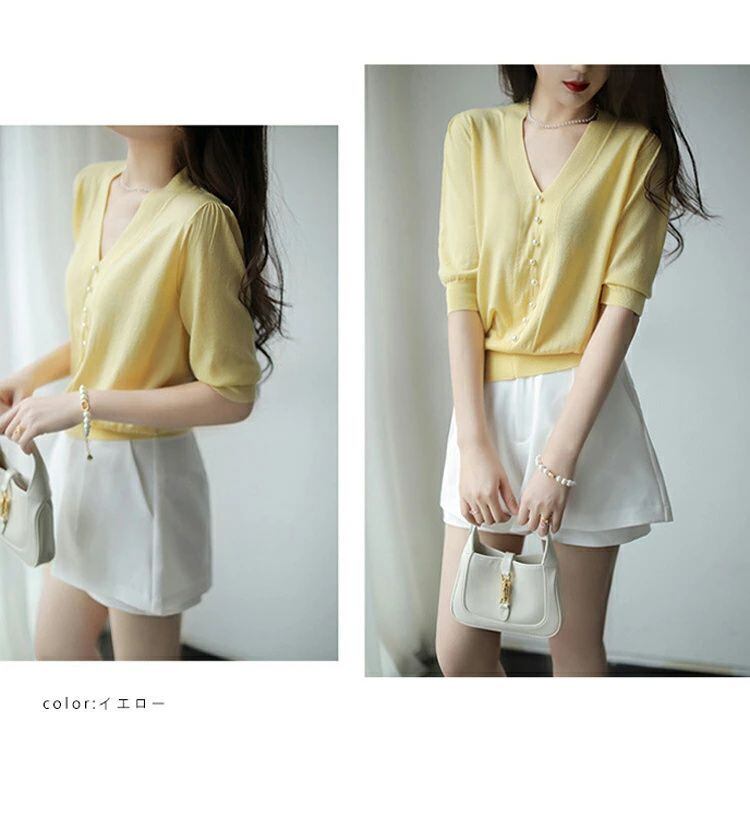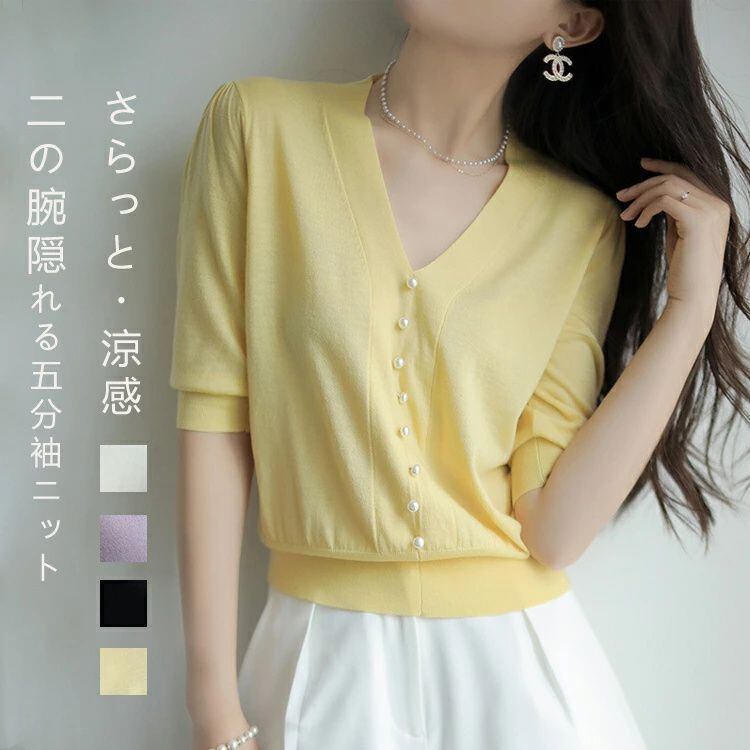 サマーニット レディース 五分袖 ニットトップス vネック tシャツ バルーンスリーブ 薄手 ニット 涼感 涼しい カラーニット ストレッチ パール vネックニット 春夏 フェミニン 女性 Tシャツ 5分袖 ギャザー 上品 洗える 通勤 OL カジュアル 夏ニット 可愛いxkxiaoz112