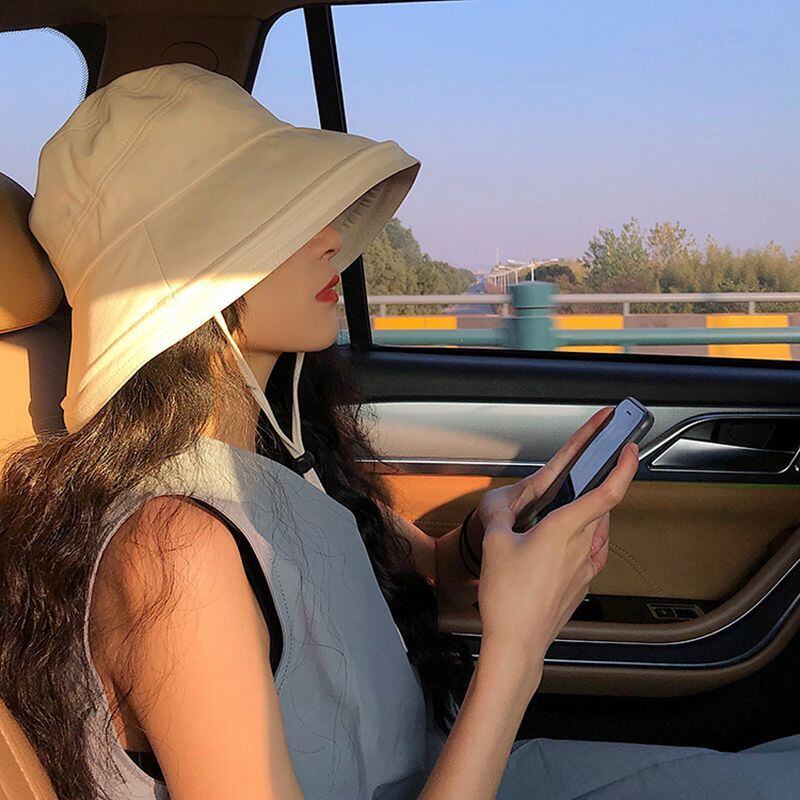 ひも付きだから自転車でも風で飛ばない、女性らしく見せるつばのデザインでUV対策もOK!