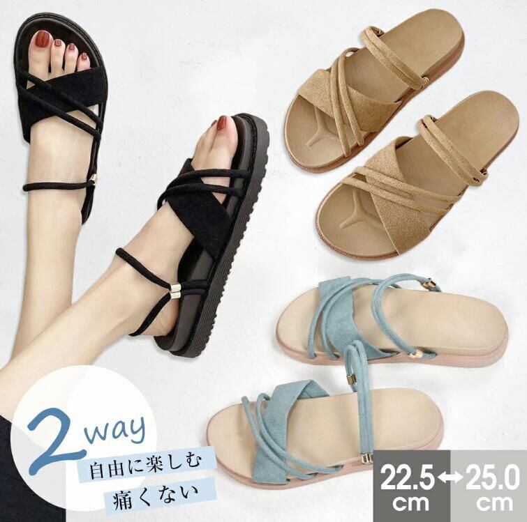 サンダル レディース カワイイ ダブルストラップサンダル 3センチヒール レディース 春夏 ミュール ブラック ベージュ ぺたんこ ローヒール フラット アンクルストラップ シンプル 履きやすい クッション xzxiaoyun369 | オキナ商店