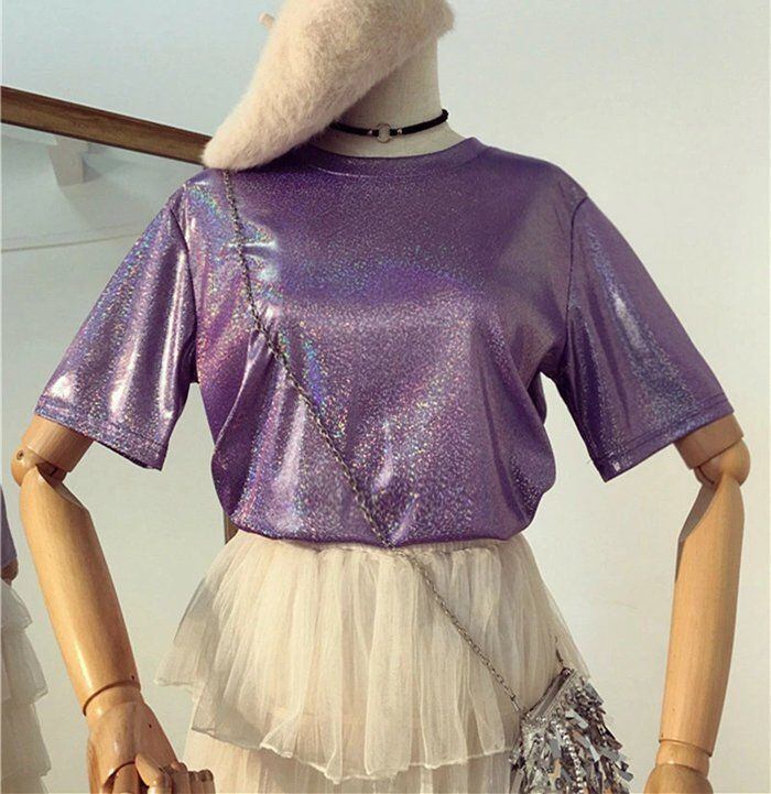 Tシャツ レディース 半袖 女性 クルーネック 丸首 ラウンドネック 光沢 キラキラ トップス 薄手 プルオーバー ラメ風 無地 可愛い おしゃれ コスチューム 個性的 ダンス 派手 HIPHOP 原宿系 weiliyas01 | オキナ商店