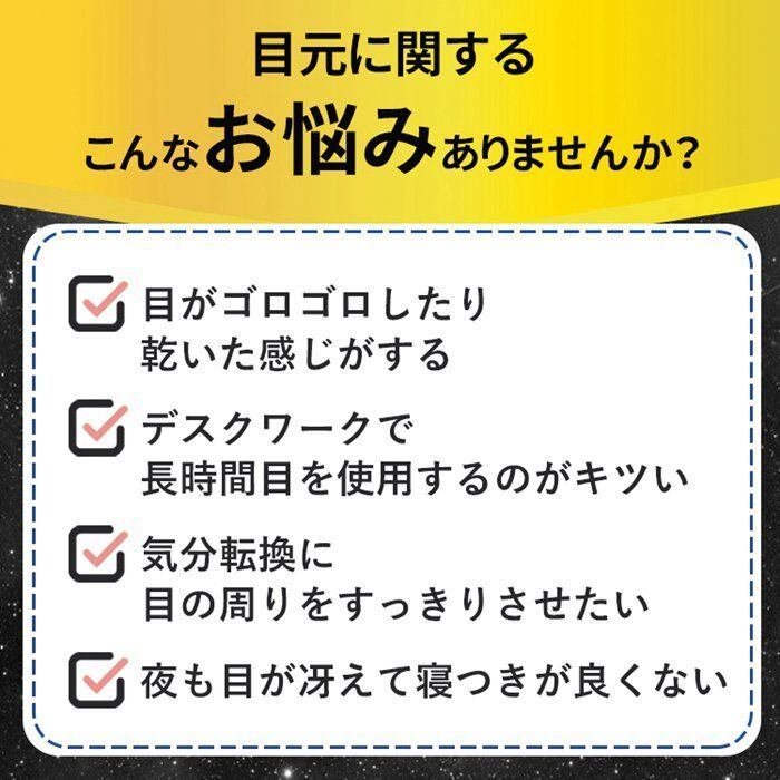 毎日パソコン業務の方、スマホを長時間している方、勉強やデスクワークで集中して作業されている方、使い捨てのホットアイマスクでいまいち満足できない方、手軽に目元のエステ、繰り返し使えるのでお得です。