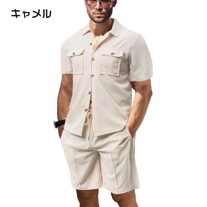 セットアップ 上下セット ワッフル 開襟 メンズ 夏 無地 涼しい カットソー Vネック 半袖Tシャツ ハーフパンツ ゴルフウェア 父の日 プレゼント 運動 ジャージ 30代 40代 50代 yifengyu147 | オキナ商店