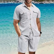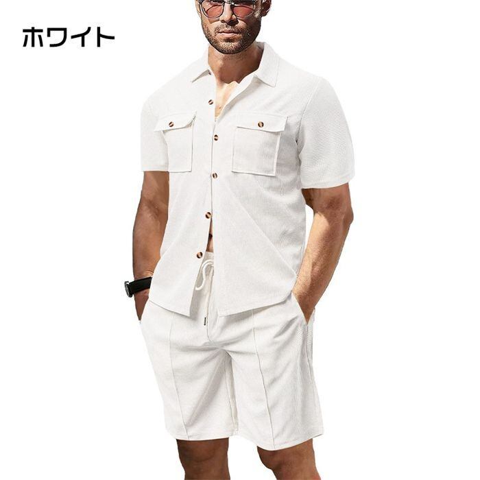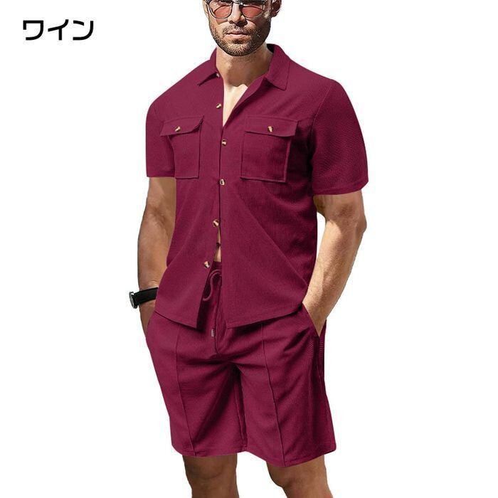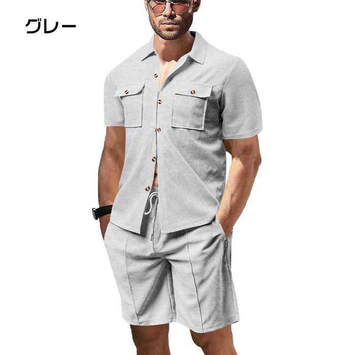 セットアップ 上下セット ワッフル 開襟 メンズ 夏 無地 涼しい カットソー Vネック 半袖Tシャツ ハーフパンツ ゴルフウェア 父の日 プレゼント 運動 ジャージ 30代 40代 50代 yifengyu147