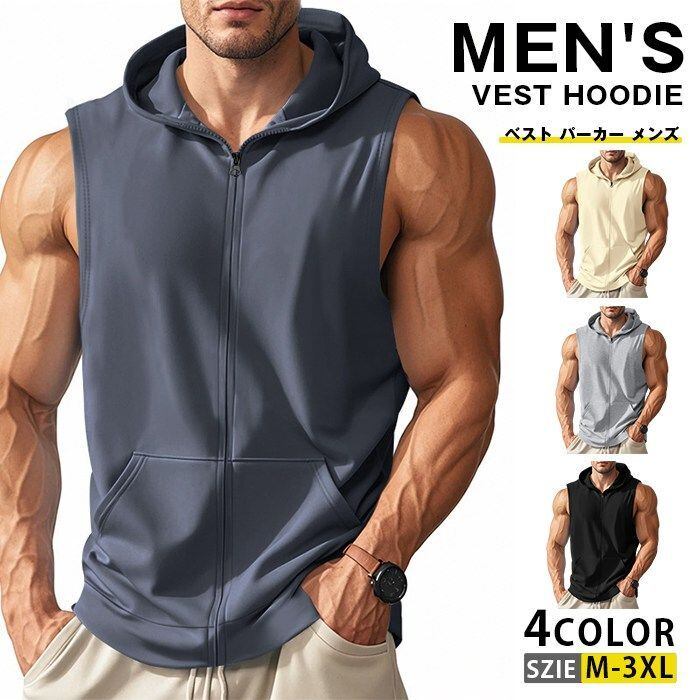 ベスト パーカー メンズ トップス 前開き ノースリーブ 重ね着 フード付き 無地 ジップアップ カーディガン スウェット おしゃれ お洒落 ナチュラル シンプル カジュアル 夏yifengyu116