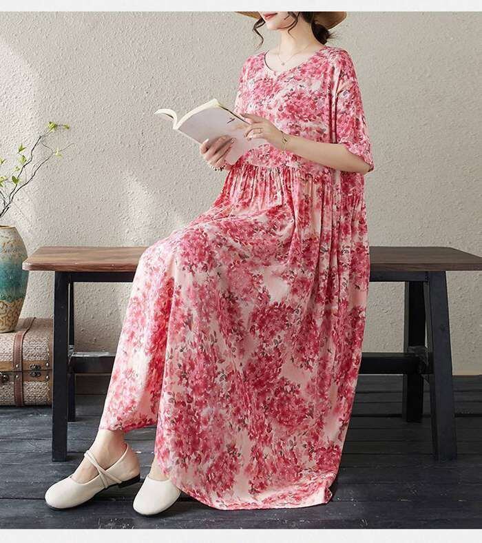 マキシワンピース レディース 半袖 ワンピース ロング丈 夏 綿 麻 刺繍 Aライン ゆったり 体型カバー フレア 大きいサイズ きれいめ リゾート オシャレ シンプル カジュアル 通勤 大人 chaoliu298