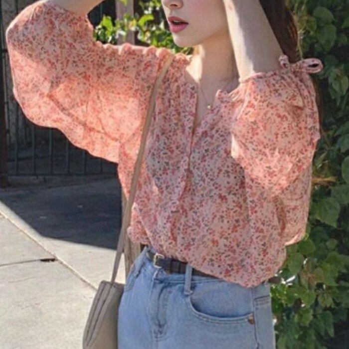 ブラウス シアー トップス シャツ レディース 長袖 シアートップス シフォン ボリューム袖 バルーン袖 柄 花柄 セクシー 透け感 大人 エレガント 華やか 春 夏 紫外線対応 韓国ファッション 20代 30代 40代 50代xiaocc10