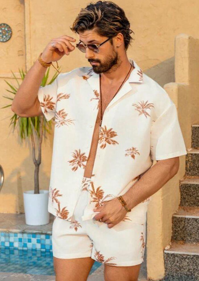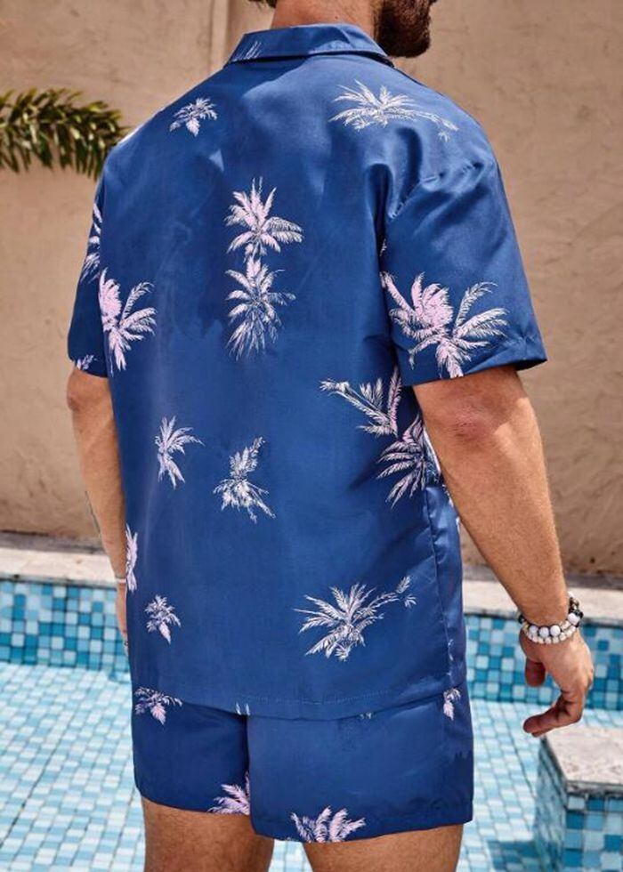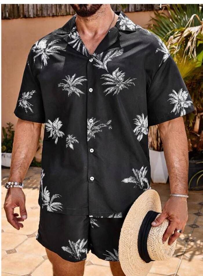ボタニカル柄 上下セット半袖トップス\u0026ドローストリング付きショーツ セットアップメンズ サマービーチウェア ピーチ