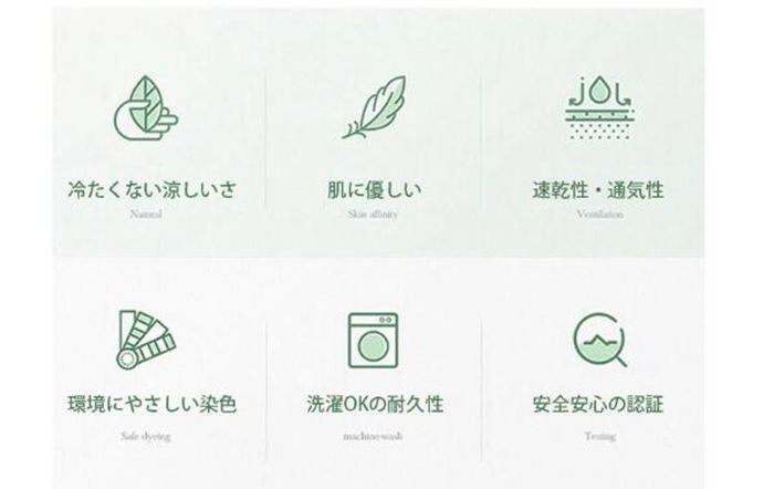 植物繊維に冷感素材を加え、植物繊維の柔らかいと冷感素材の涼しいさを持って、敏感肌・腰が弱い・体が弱い人におすすめ。