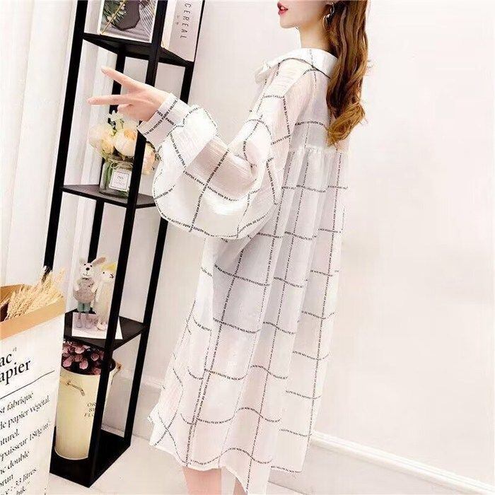 チェックシャツ シアー トップス ロングシャツ UVカット レディース 長袖 シアートップス シフォン ボリューム袖 バルーン袖 セクシー 透け感 大人 エレガント 華やか 春 夏 紫外線対応 韓国ファッション 20代xiaocc22 | オキナ商店