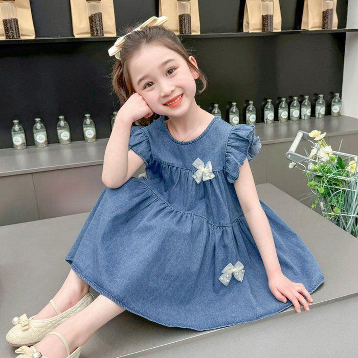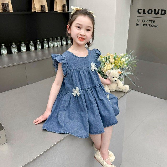子供服 ワンピース フレア袖 子供服 女の子 デニム ブルーワンピース キッズ 女児 小学生 キッズ 可愛い おしゃれ カジュアル 90cm 100cm 110cm 120cm 130cm jinrui06 | オキナ商店