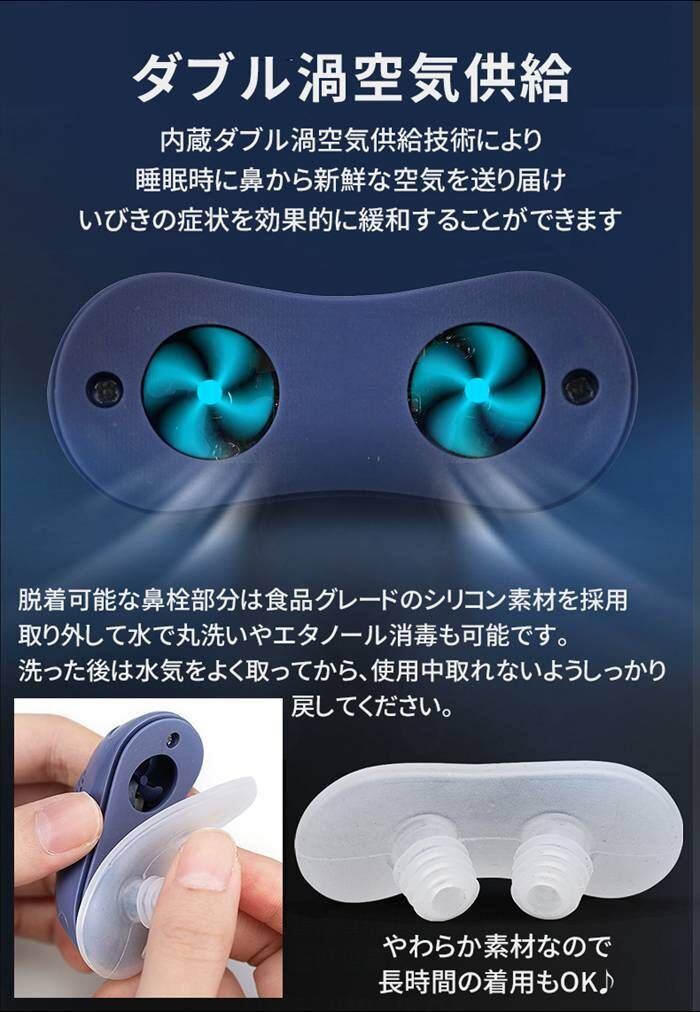 ■ダブル渦空気供給:電動いびき防止内蔵ダブル渦空気供給技術により、睡眠時に鼻から新鮮な空気を送り届け、いびきの症状を効果的に緩和することができます。