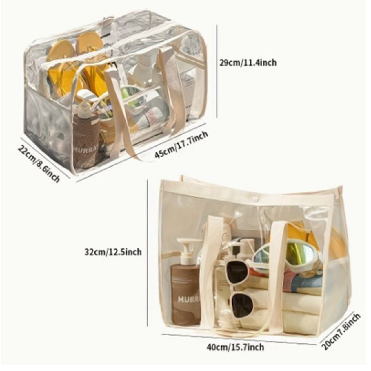 【おしゃれデザイン】:オシャレ女子には最高の、中が見えるクリアバッグです!お気に入りのタオルやポーチや小物を見せることができます☆彡たくさんの大人かわいいグッズを入れたバッグを持って、女子力UPです!