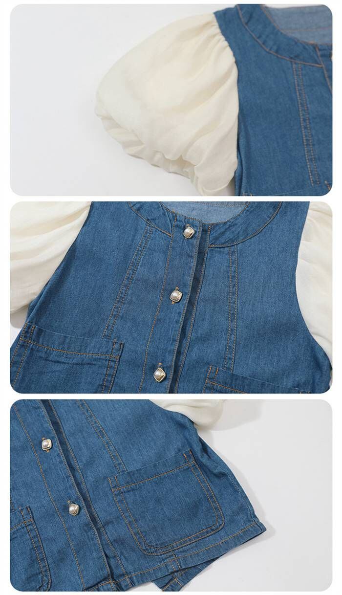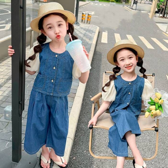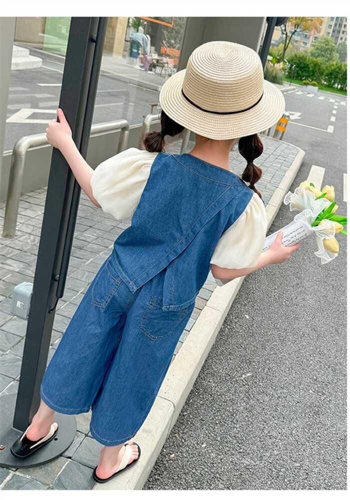 上下セット デニムセットアップ 女の子 セットアップ バブルスリーブ ブラウン ワイドパンツ セット 子供服 女児 小学生 キッズ ボトムス 可愛い おしゃれ カジュアル 90cm 100cm 110cm 120cm 130cm 140cm jinrui14