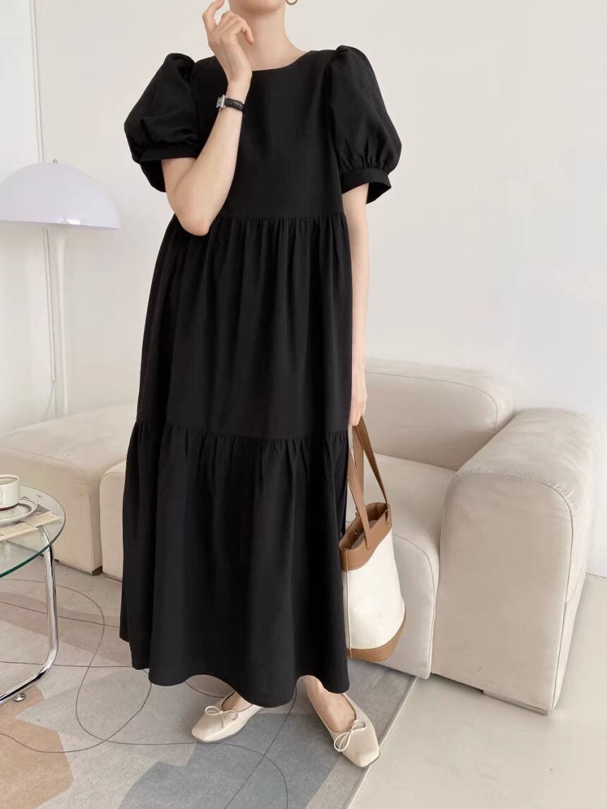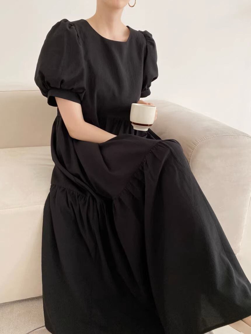新品 ロングワンピース 半袖 パフスリーブ ワンピース 夏 ゆったり レディース マキシ丈 ロング丈 ワンピース バルーン袖 体型カバー 着痩せ シンプル カジュア 薄手 ルームウェア kkkxqm | オキナ商店