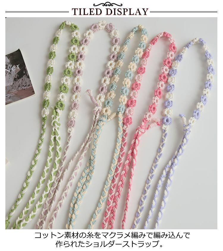 花の柄編みデザインがかわいいスマホ用ショルダーストラップ。
