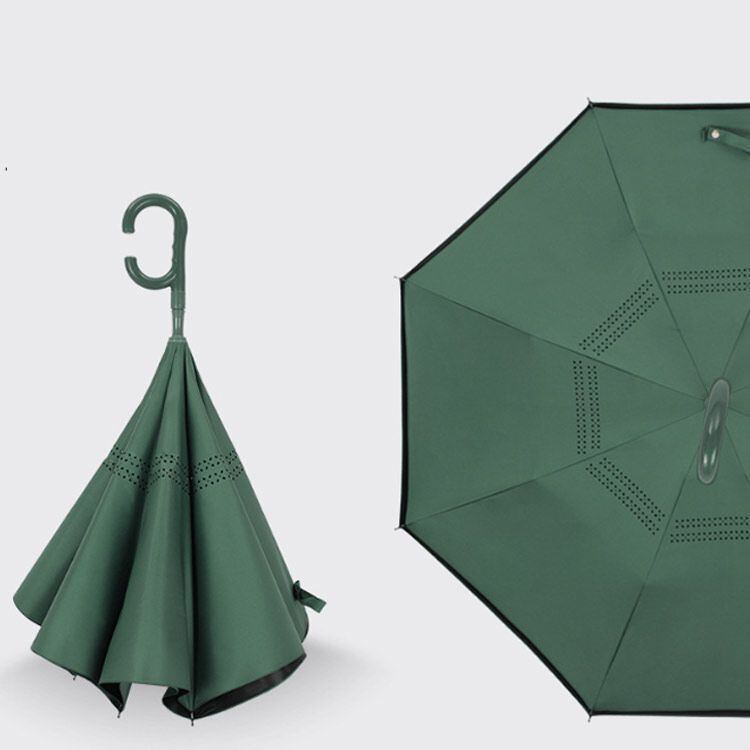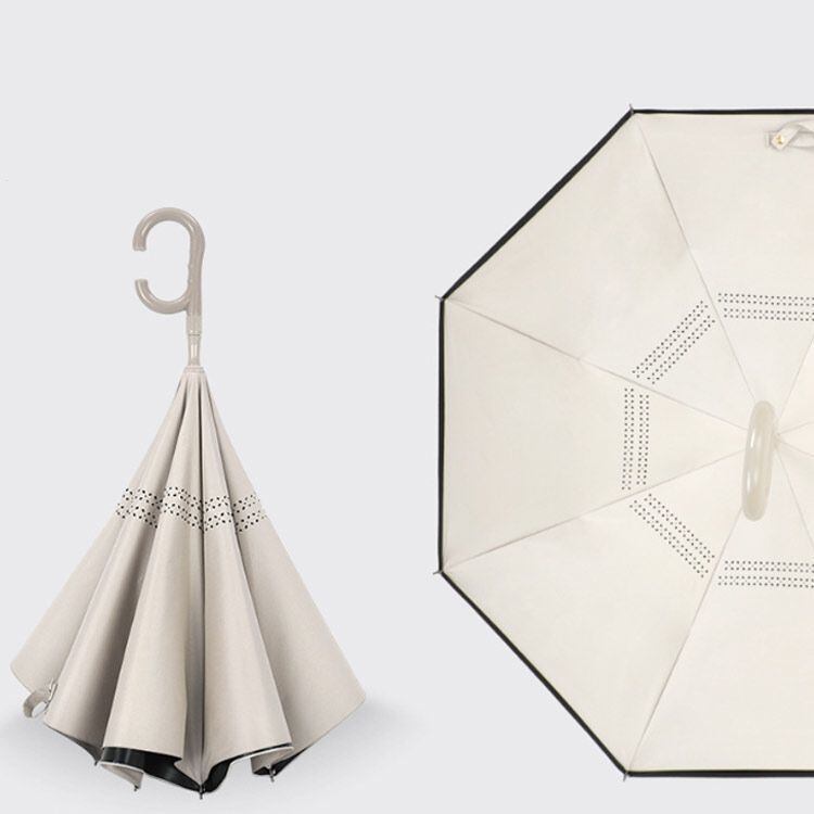 普通の傘とは反対に開閉するので、濡れた部分が内側になり、手が濡れにくく、車に乗った際も車内がぬれにくい。