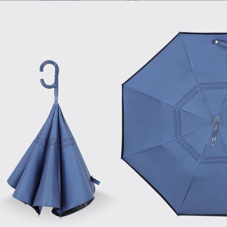 普通の傘とは反対に開閉するので、濡れた部分が内側になり、手が濡れにくく、車に乗った際も車内がぬれにくい。